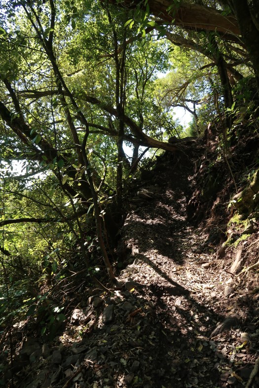 The most raved about trail, however, is one of the latest additions to Nelson’s trail network: Te Ara Koa. This trail opened in October 2017 after thousands of hours from the Nelson Mountain Bike Club volunteer builders. It starts from the top of Fringed Hill and drops 700 meters on 5.1 kilometers through native woods. The handcrafted pure singletrack is kept quite natural and runs across roots and mostly rocks. Te Ara Koa was a quite special experience for me. After browsing all morning through the Codgers trail network I started my climb on the Fringed Hill in the heat of the early afternoon sun. The uphill on the rough gravel road was just agonizing particularly after a bee stung in my ear. On top of the 793 meters high Fringed Hill the Te Ara Koa took me on a thrilling ride back down into the valley again. Steep, tight and rocky yet all rideable, but not with much space for mistakes. Because of the heavy rain in days before roots and rocks were slippery. So, I had had a couple of shock moments when I was slip-sliding away from the sometimes only 20 centimeters wide trail corridor with the risk of falling down the precipice. All in all, a truly impressing ride.