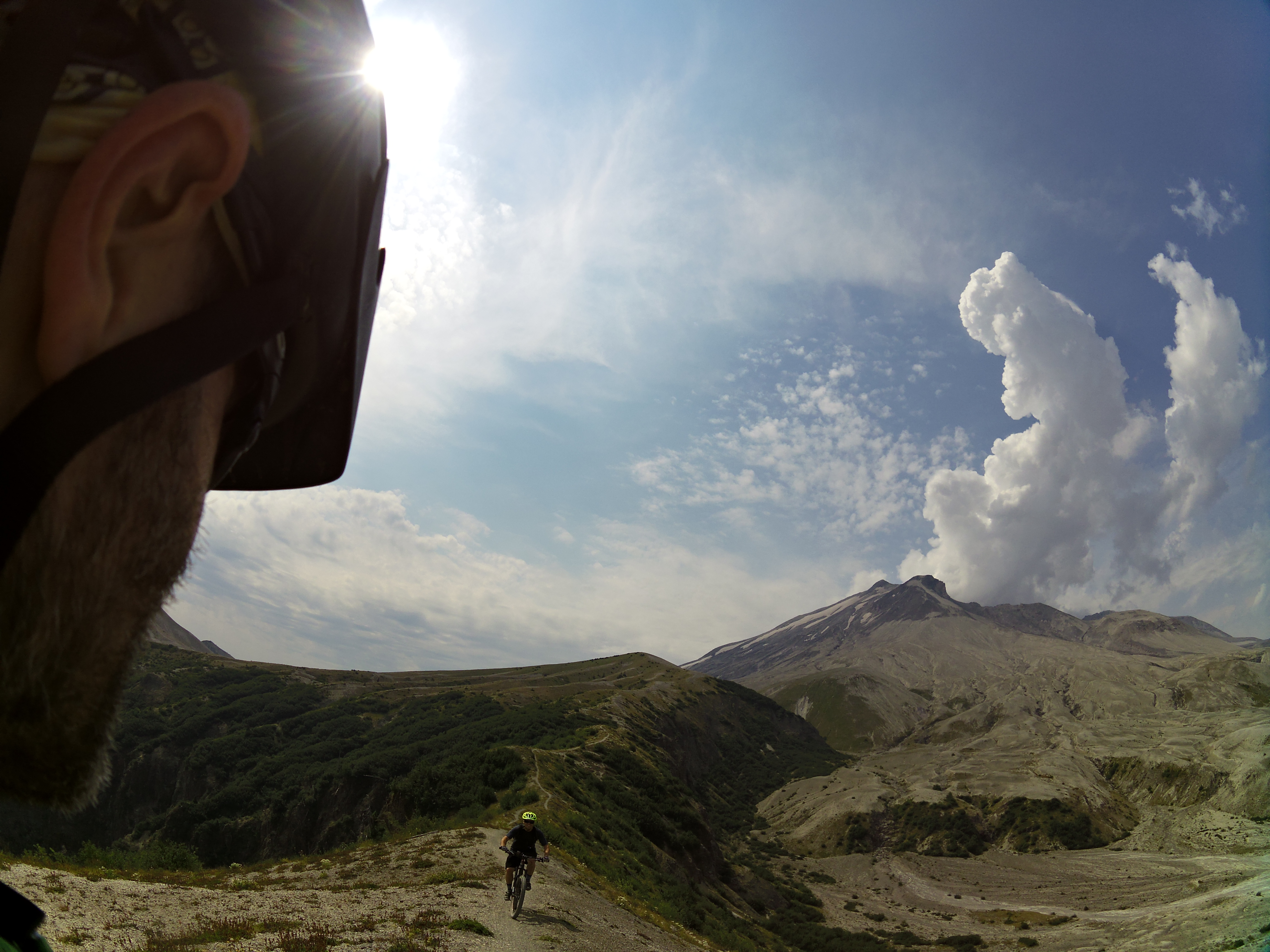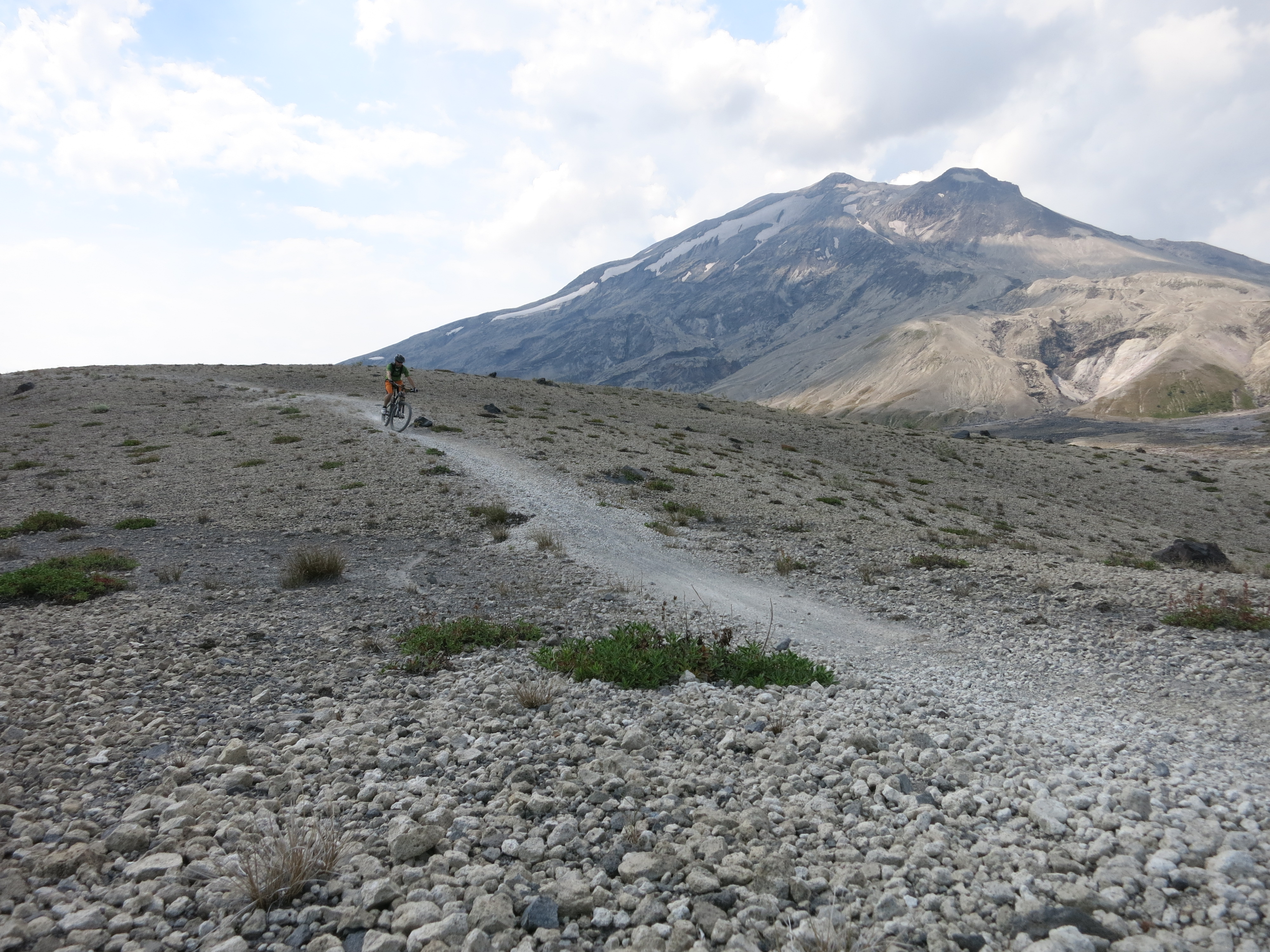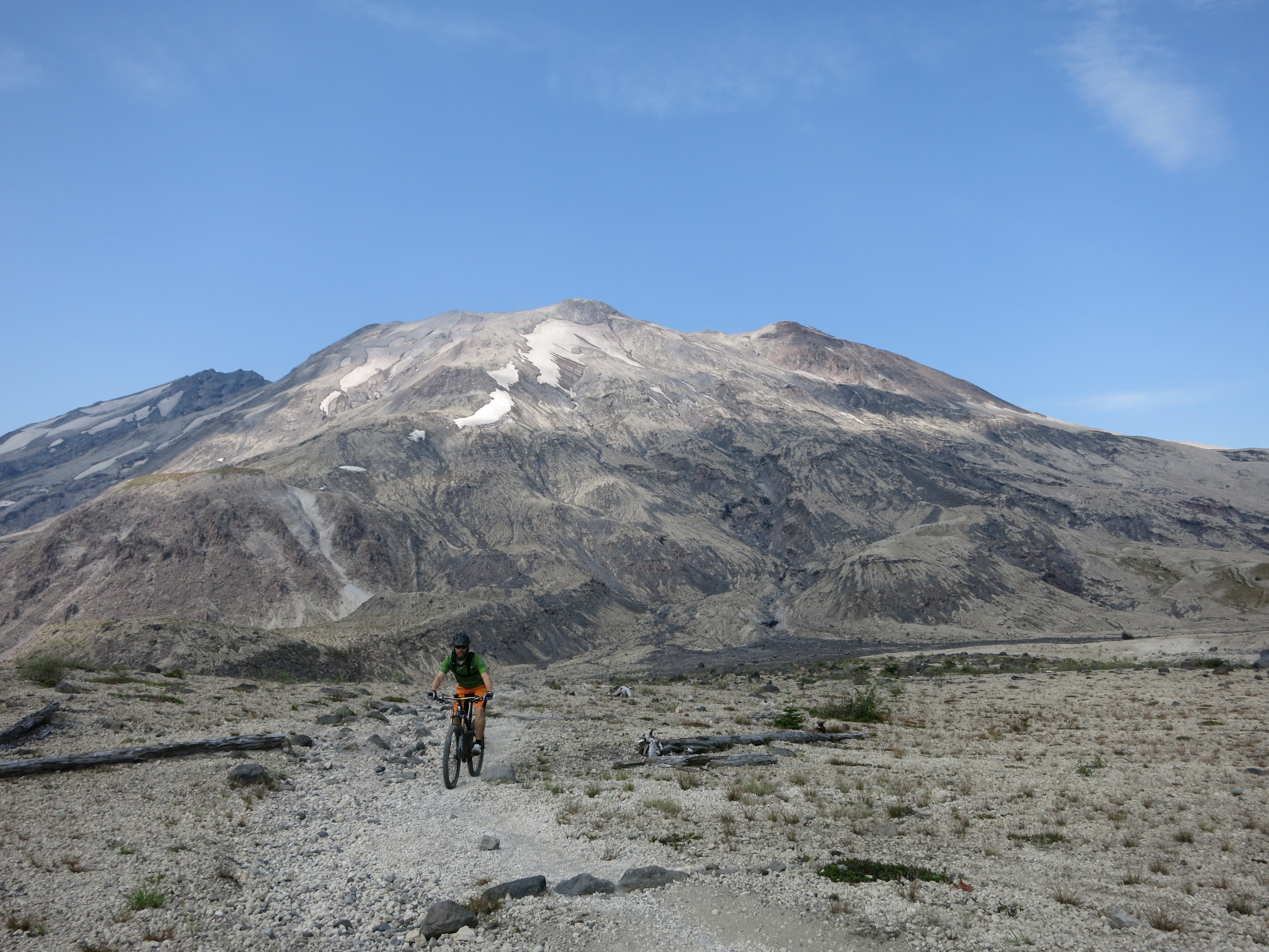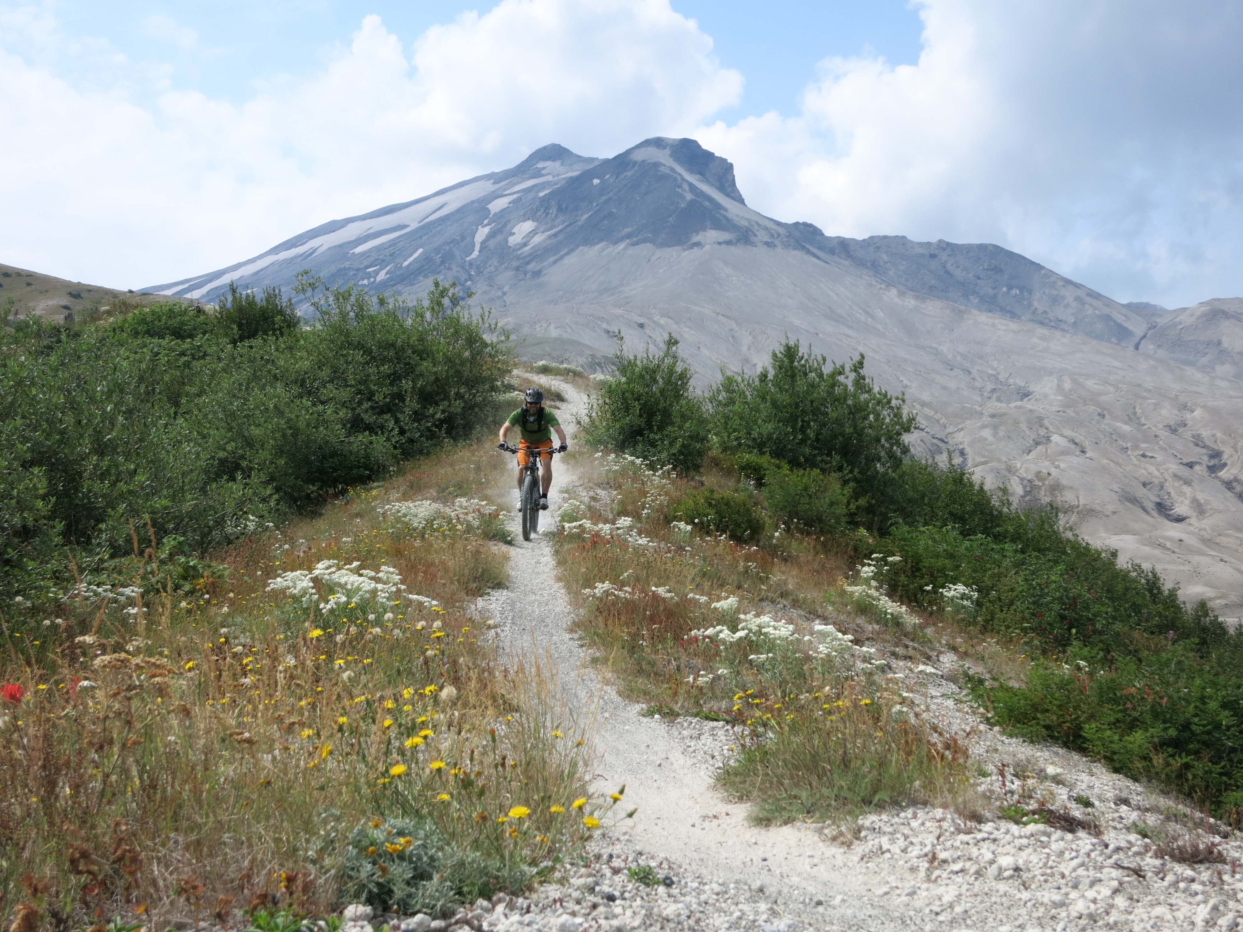 The Ape Canyon Trail up to the Plains of Abraham on Mount Saint Helens is a unique experience due to its special history. Mt. Saint Helens is the volcano that errupted in 1980 and literally blew up its top 400 meters. A part of the peak came down as pumice and ash and formed the Plains of Abraham – a lunarlike landscape. It is one of my favorite rides because of the breathtaking landscape and views and the fun surfing down the pumice and zipping down the flowy singletrack trail. From the trailhead near Lava Canyon the ride starts with strenous uphill through a stretch of old grown forest that has survived the erruption while mud and lava flows to left and right have taken away any other vegetation. At the top of the trail spectacular views are waiting and the ride across the Plains of Abraham begins. After half circling the Mt. Saint Helens crater to Windy Ridge there is either the option to continue down to Smith Creek for an epic loop or to turn around and enjoy the Ape Canyon Trail as a zippy downhill.
