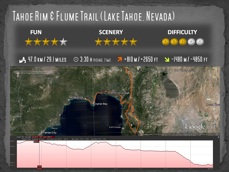 The Tahoe Rim & Flume Trail is a legendary MTB-ride through fascinating nature with stunning views. It is best done as shuttle ride starting at Tahoe Meadows on the Tahoe Rim Trail (shuttle services are available in Incline Village).