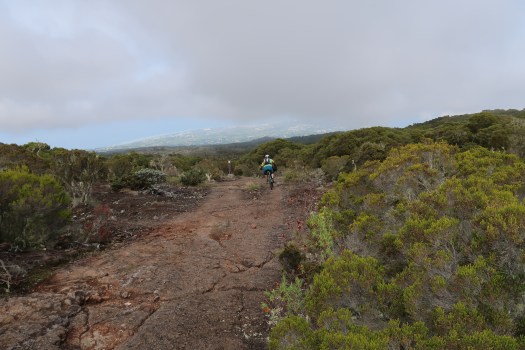 The bike adventure on La Réunion usually starts with a shuttle lift to Le Maido, one of the older volcanic peaks on the island, at an altitude of about 2200 meters above sea level. The following downhill feast is served on rugged lava rock as a starter and continues in lush jungle forest for the main course. The final descent to the beaches is in a savanna like setting – sweet dessert.