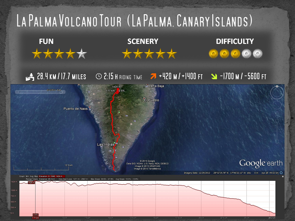 The Caldera de Taburiente is like a huge hole in the middle of La Palma. The northern rim of the caldera rises up to an elevation of 2.426 meters (Roque de los Muchachos) and offers great views as well as great MTB-trails. The most challenging trail runs on the rim of the caldera all the way down to Tazacorte, an ocean harbor with beaches. And, of course there are many other trails with less exposure in the north-west of the Roque de los Muchachos that want to be explored…