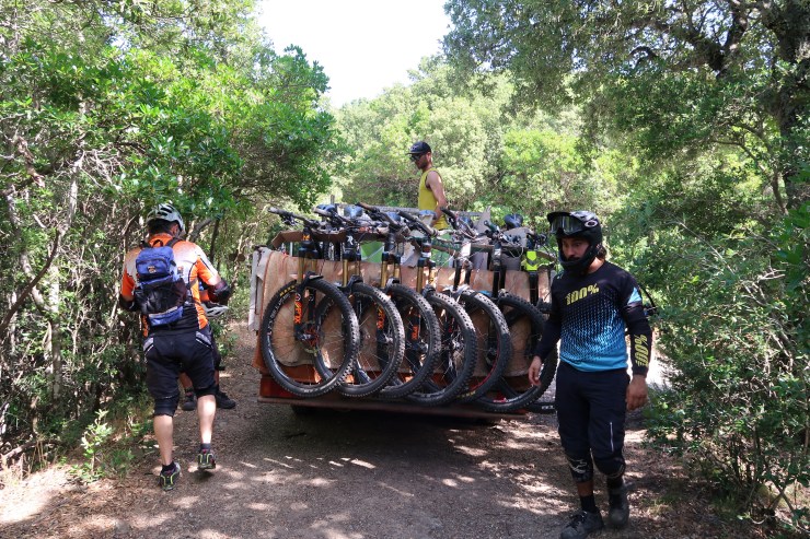 All Bikes Santadi (https://www.facebook.com/ALLBIKESSANTADI/ ) offers a monthly shuttle day and builds and maintains the trails in the pristine Pantaleo Forest. Battista and Loris took us uphill with their shuttle-truck on a steep and rugged forest road so we could zip down down the two lines Ritmo Sbilenco and Le Egue several times. The Ritmo Sbilenco is an about 2 km long line with tight turns on loose dirt under shady trees while Le Egue is mostly on rocky surface with some berms and jumps. Another trail, the S8, runs across a mountain ridge and was initially built for charcoal production. Nowadays, it is churned up by wild boar and flattened by fat MTB-tires. After all we had a magnificent day of enduro riding with the local MTB-community including a delicious picnic lunch in the forest followed by a refreshing bath in a river. To hook up with local riders contact “ALLBIKESSANTADI” on Facebook or “Denis_Mirror” on Instagram.
