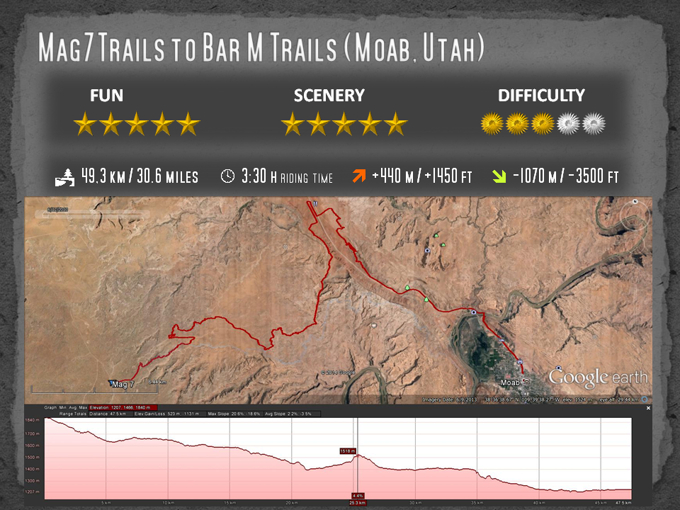 The “Mag7” name’s origin comes from 7 magnificent trails in the upper area of Gemini Bridges Road. And I fully agree that they are indeed magnificent. This is the sort of Moab-ride you dream of: views of Arches N.P. and other bizarre rock formations, tight turns, slickrock and red dirt, flow and fun.