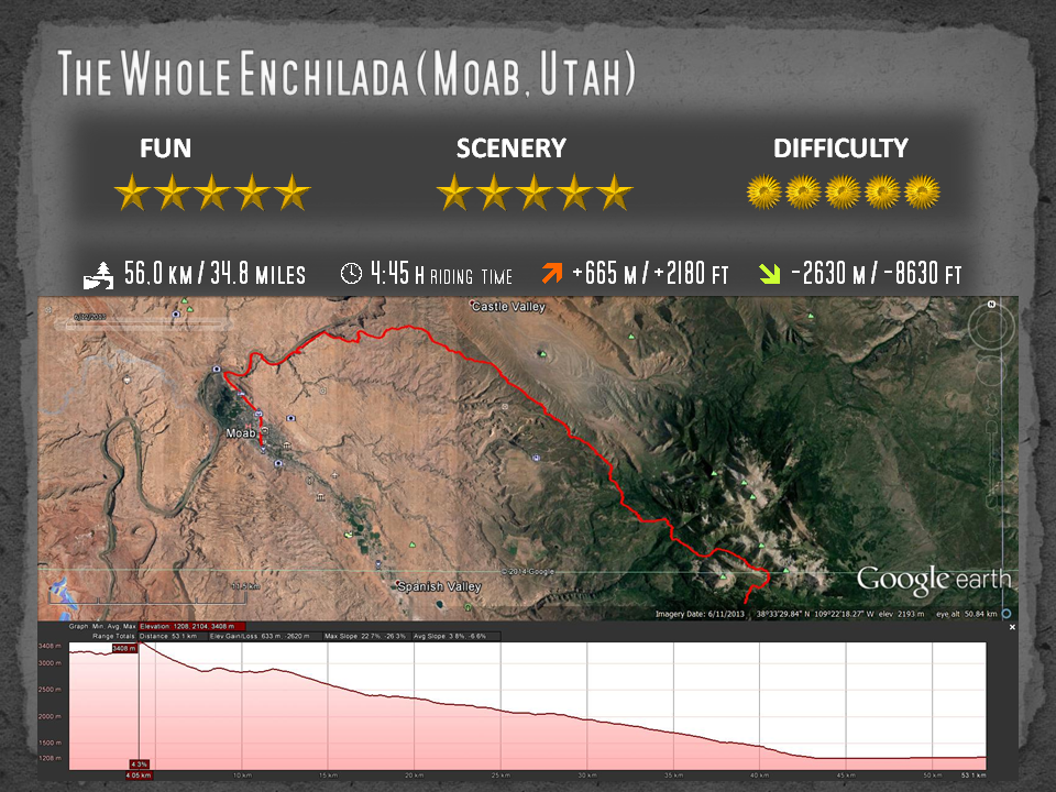 Whole Enchilada is the most raved about MTB-ride in and outside of Moab. And as the name suggests, it has it all: high-altitude alpine riding, smooth slalom berms, slickrock, views, technical challenges, etc. It can be ridden as an epic loop with a length of 61 miles/100 km and a total elevation gain of 8300 feet/2500 meters.