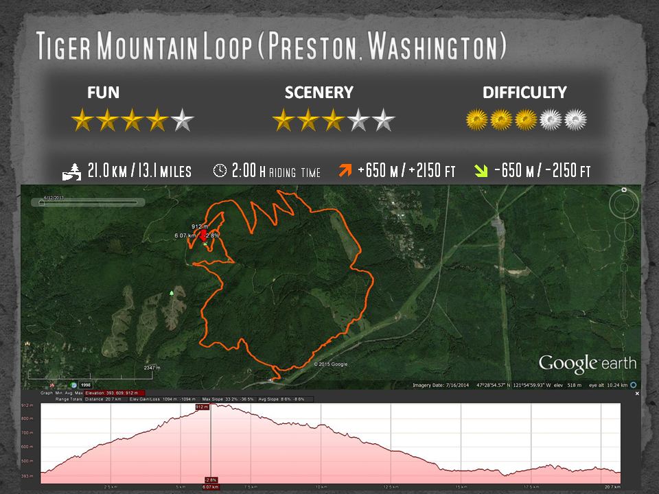 The first part is only about gaining 640 meters of elevation on a forest road up the Tiger Mountain Summit. The reward for the unspectacular climb is a long fun downhill trail. Particularly the upper section that starts at the summit and that was added recently is zippy and pure fun. It winds down like a pump track that lets you fly down the hill with great flow and some airtime. The Summit Trail connects to the Preston Railroad Trail which is a little more rugged with roots and rocks, however, all rideable and still with good flow especially in the lower section. The timberline trail that offers great views takes you back to the trailhead through a lush old forest.